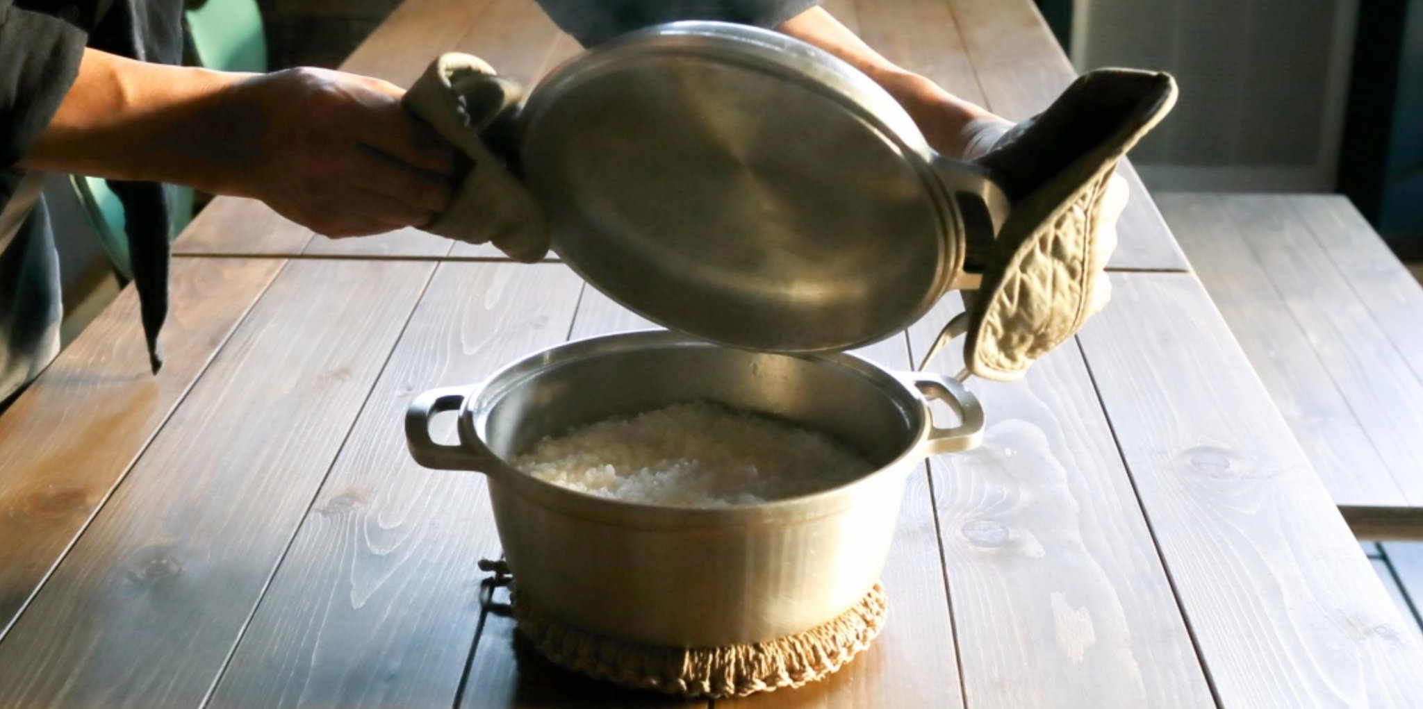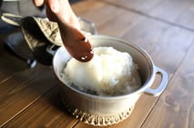 炊き立てのごはん、味噌汁が並びます。